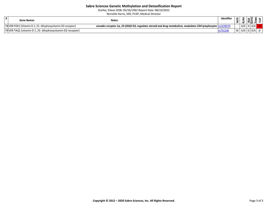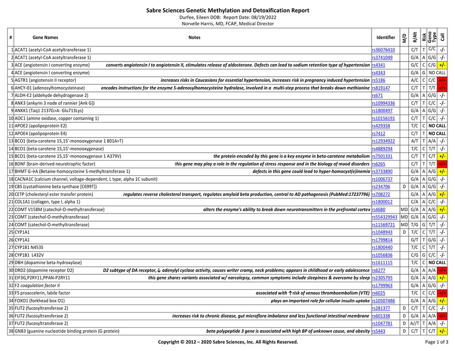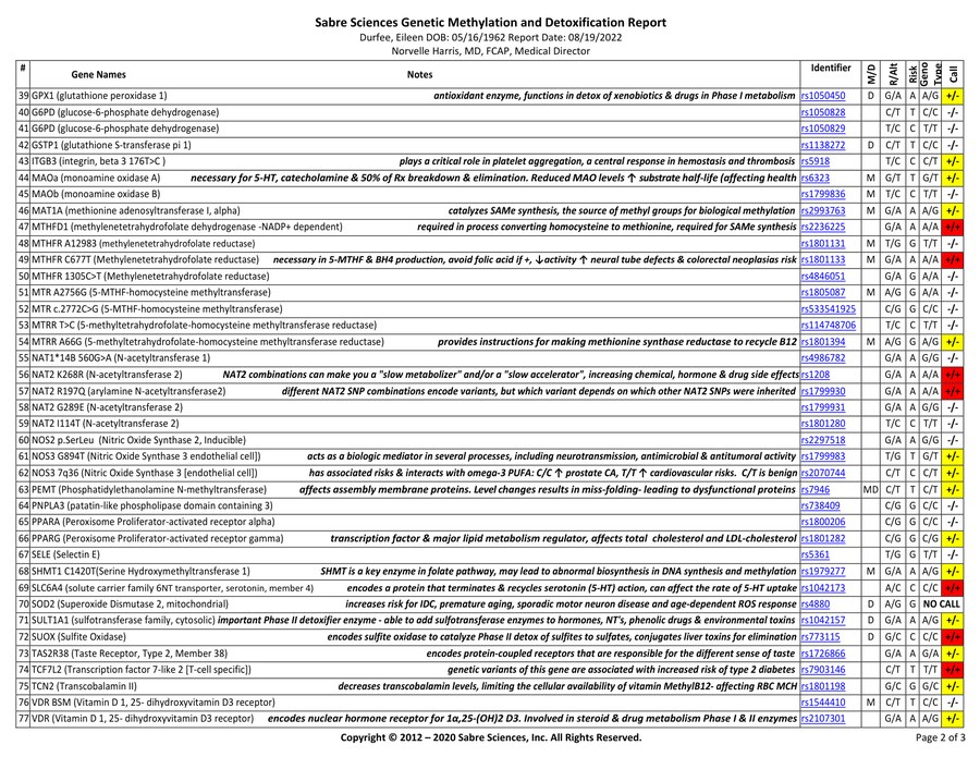 Eileen’s genetic report shows an unusually dense pattern of functional variants across methylation, detox, neurotransmitter, and vitamin D receptor pathways—far more than the average person. Below you’ll find a clear comparison to population norms, practical takeaways from her HTMA hair analysis, and all three lab images for transparency.